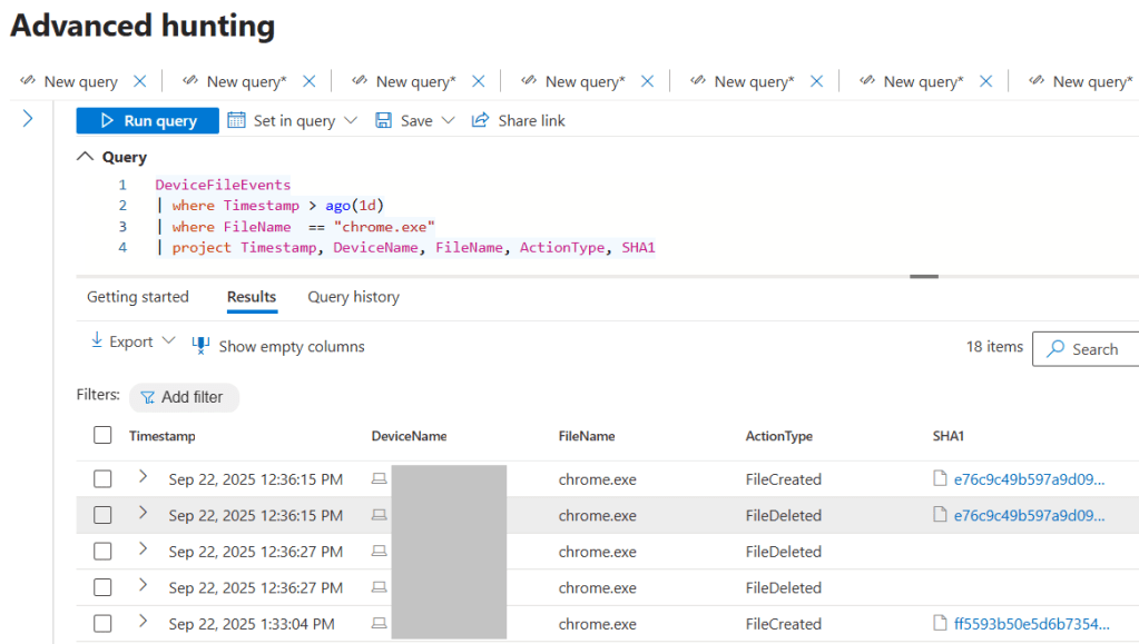 As Microsoft documentations puts it, DeviceFileEvents “contains information about file creation, modification, and other file system events”. This is particularly useful, for example, in security incident scenarios where finding out how many devices have had a specific malicious file on disk.